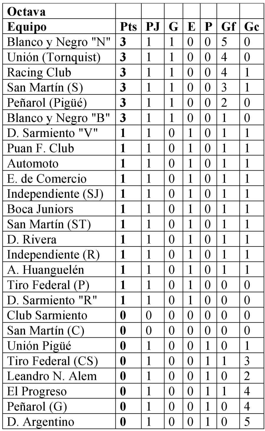 Octava: Atlético Huanguelén 1 vs. Independiente de Rivera 1; Blanco y Negro “Negro” 5 vs. Deportivo Argentino 0; Deportivo Rivera 1 vs. San Martín de Santa Trinidad 1; San Martín de Saavedra 3 vs. Tiro Federal de Coronel Suárez 1; Unión Pigüé 0 vs. Blanco y Negro “Blanco” 1; Boca Juniors 1 vs. Independiente de San José 1; Unión de Tornquist 4 (Pelliza x2, Parra y Godino) vs. Peñarol de Guaminí 0; Deportivo Sarmiento “Rojo” 0 vs. Tiro Federal de Puan 0; Leandro N. Alem de Coronel Pringles 0 vs. Peñarol de Pigüé 2; Empleados de Comercio 1 vs. Automoto 1 (Vallese); El Progreso 1 vs. Racing Club 4 y Puan F. Club 1 vs. Deportivo Sarmiento “Verde” 1. Libres: Club Sarmiento y San Martín de Carhué.