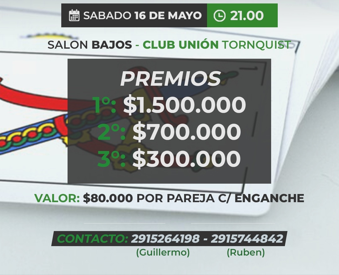 El Torneo de Truco del Club Unión de Tornquist, previsto para el 9 de mayo, fue reprogramado, por cuestiones de agenda, para el sábado 16 de mayo.
