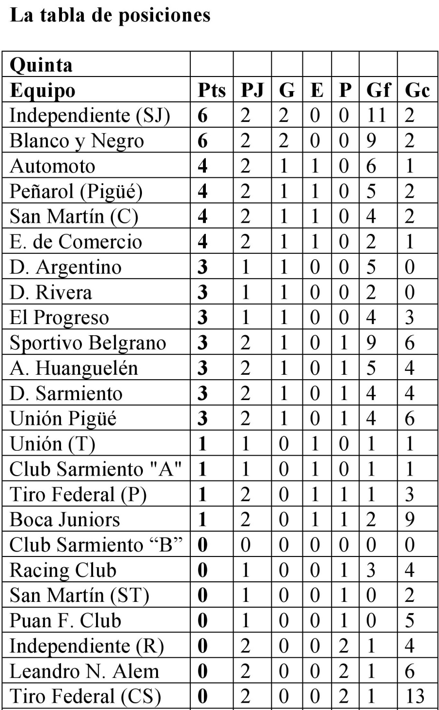 Quinta: Blanco y Negro 3 vs. Atlético Huanguelén 2; Tiro Federal de Coronel Suárez 0 vs. Unión Pigüé 4; Deportivo Argentino 5 vs. Sportivo Belgrano de Espartillar 0; Independiente de San José 4 vs. Deportivo Sarmiento 2; San Martín de Carhué 3 vs. Leandro N. Alem de Coronel Pringles 1; Automoto 5 vs. Puan F. Club 0; Peñarol de Pigüé 2 vs. Boca Juniors 2; Independiente de Rivera 0 vs. Empleados de Comercio 1 y Tiro Federal de Puan 1 vs. Unión de Tornquist 1. Postergado: Club Sarmiento “Blanco” vs. Club Sarmiento “Azul”. Libres: Racing Club, San Martín de Santa Trinidad, El Progreso y Deportivo Rivera.