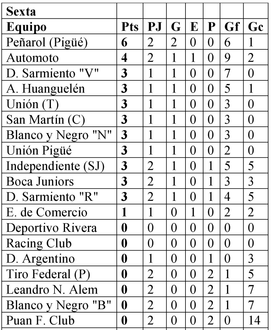 Sexta: Blanco y Negro “Blanco” 1 vs. Atlético Huanguelén 5; Independiente de San José 4 vs. Deportivo Sarmiento “Rojo” 2; San Martín de Carhué 3 vs. Leandro N. Alem de Coronel Pringles 0; Automoto 7 vs. Puan F. Club 0; Peñarol de Pigüé 2 vs. Boca Juniors 0 y Tiro Federal de Puan 0 vs. Unión de Tornquist 3. Libres: Racing Club, Blanco y Negro “Negro”, Unión Pigüé, Deportivo Sarmiento “Verde”, Deportivo Argentino, Empleados de Comercio y Deportivo Rivera.