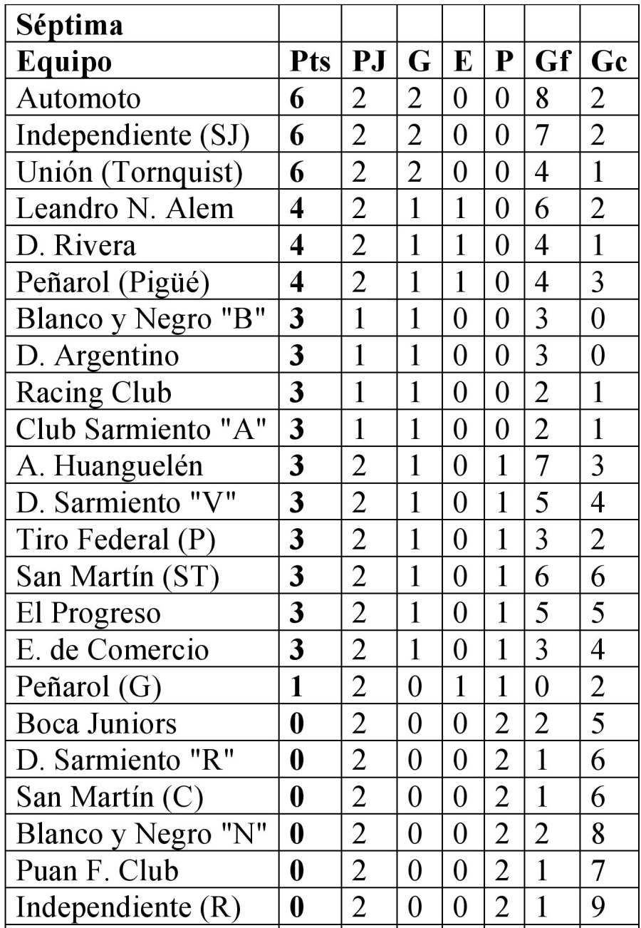 Séptima: San Martín de Santa Trinidad 5 vs. Blanco y Negro “Negro” 2; Blanco y Negro “Blanco” 3 vs. Atlético Huanguelén 0; Deportivo Sarmiento “Verde” 3 vs. El Progreso 4; Independiente de San José 4 vs. Deportivo Sarmiento “Rojo” 1; San Martín de Carhué 0 vs. Leandro N. Alem de Coronel Pringles 4; Automoto 5 vs. Puan F. Club 1; Peñarol de Pigüé 2 vs. Boca Juniors 1; Independiente de Rivera 1 vs. Empleados de Comercio 2; Peñarol de Guaminí 0 vs. Deportivo Rivera 0 y Tiro Federal de Puan 1 vs. Unión de Tornquist 2. Postergado: Club Sarmiento “Blanco” vs. Club Sarmiento “Azul”. Libres: Racing Club, Tiro Federal de Coronel Suárez y Deportivo Argentino.