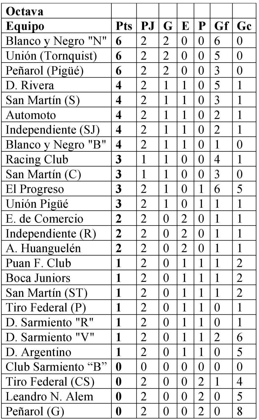 Octava: San Martín de Santa Trinidad 0 vs. Blanco y Negro “Negro” 1; Blanco y Negro “Blanco” 0 vs. Atlético Huanguelén 0; Tiro Federal de Coronel Suárez 0 vs. Unión Pigüé 1; Deportivo Sarmiento “Verde” 1 vs. El Progreso 5; Deportivo Argentino 0 vs. San Martín de Saavedra 0; Independiente de San José 1 vs. Deportivo Sarmiento “Rojo” 0; San Martín de Carhué 3 vs. Leandro N. Alem de Coronel Pringles 0; Automoto 1 vs. Puan F. Club 0; Peñarol de Pigüé 1 vs. Boca Juniors 0; Independiente de Rivera 0 vs. Empleados de Comercio 0; Peñarol de Guaminí 0 vs. Deportivo Rivera 4 y Tiro Federal de Puan 0 vs. Unión de Tornquist 1. Libres: Racing Club y Club Sarmiento.