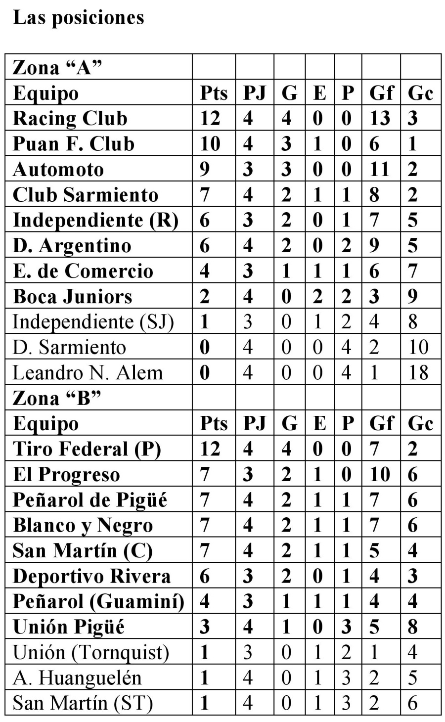 En la Zona A, el nuevo líder es Racing de Carhué, que aprovechó tener un partido más para treparse a lo más alto y superar a Automoto en la tabla. También Puan FC logró dejar atrás al conjunto de Tornquist, que ahora quedó en la tercera posición pero con un encuentro menos, manteniéndose igualmente en la pelea.