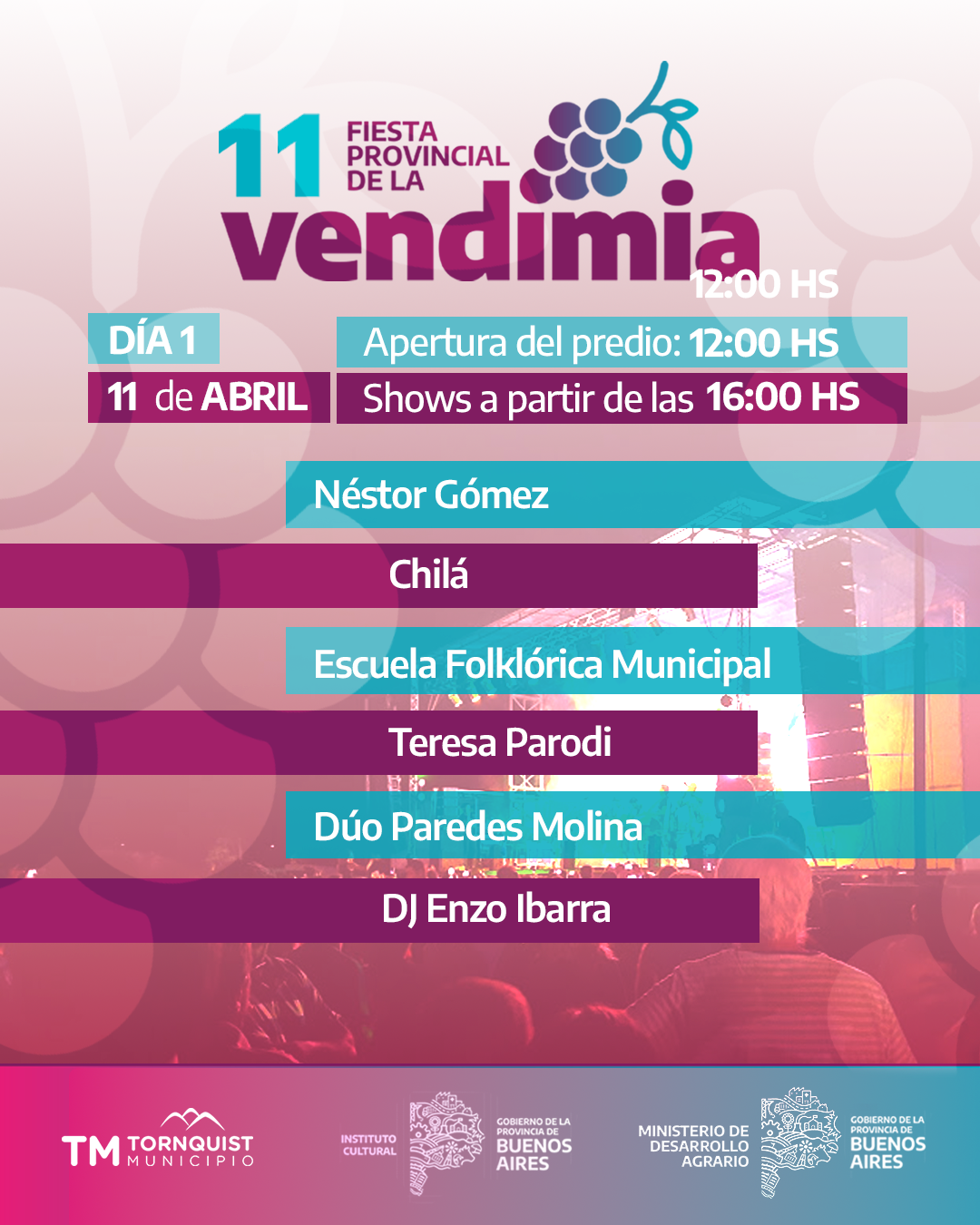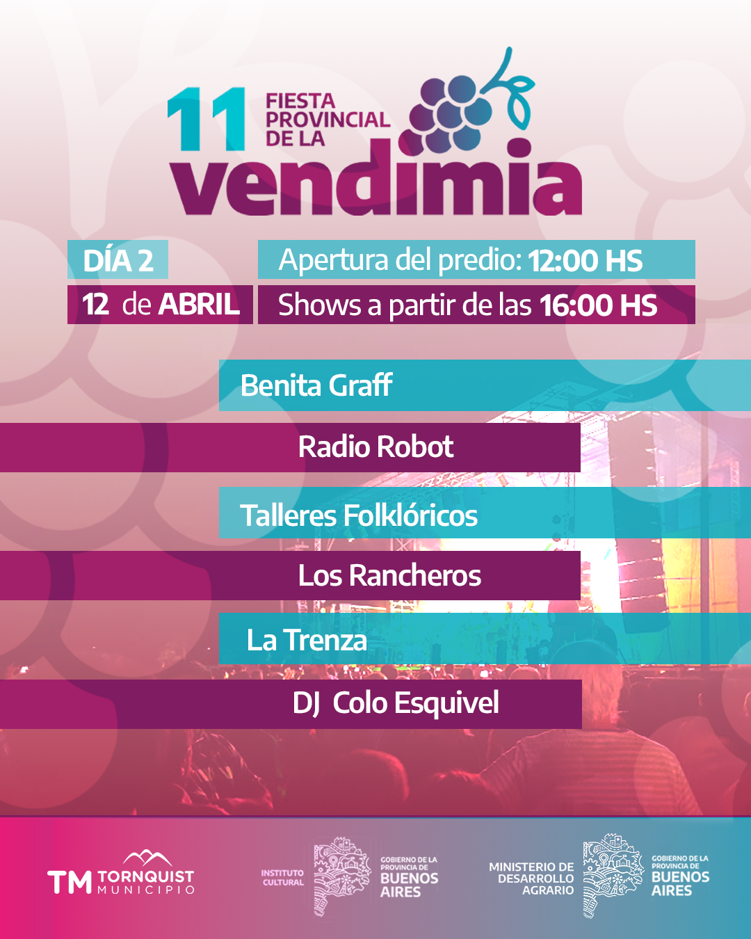 La localidad de Saldungaray será escenario de una nueva edición de la Fiesta Provincial de la Vendimia, que se llevará a cabo este sábado 11 y domingo 12 de abril, con una propuesta pensada para disfrutar en familia y celebrar la identidad productiva y cultural del distrito.