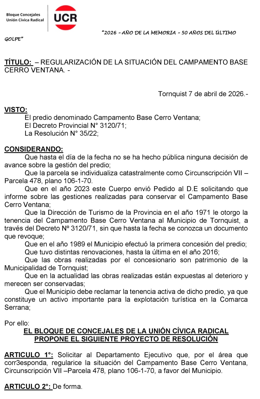 Presentamos Proyecto de Resolución solicitando al Departamento Ejecutivo que, por el área que corresponda, regularice la situación del Campamento Base Cerro Ventana, Circunscripción VII –Parcela 478, plano 106-1-70, a favor del Municipio.