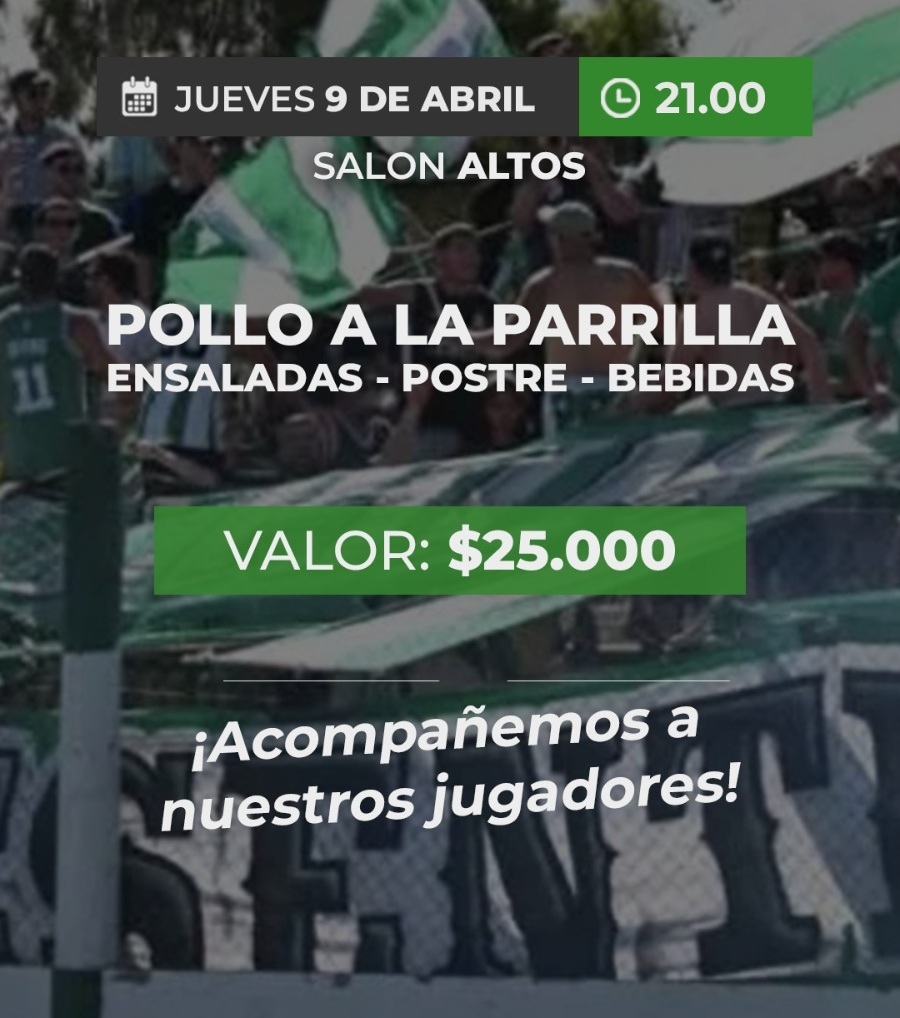 Tendrá lugar en el Salón Altos y el menú constará de pollo a la parrilla, ensalada, bebida y postre. Las tarjetas tienen un valor de $25000 y se adquieren comunicándose con cualquier miembro de la comisión directiva de la entidad.