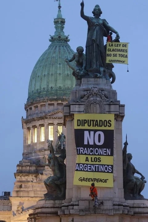 Ley de Glaciares: un activista se trepó a un monumento en el Congreso