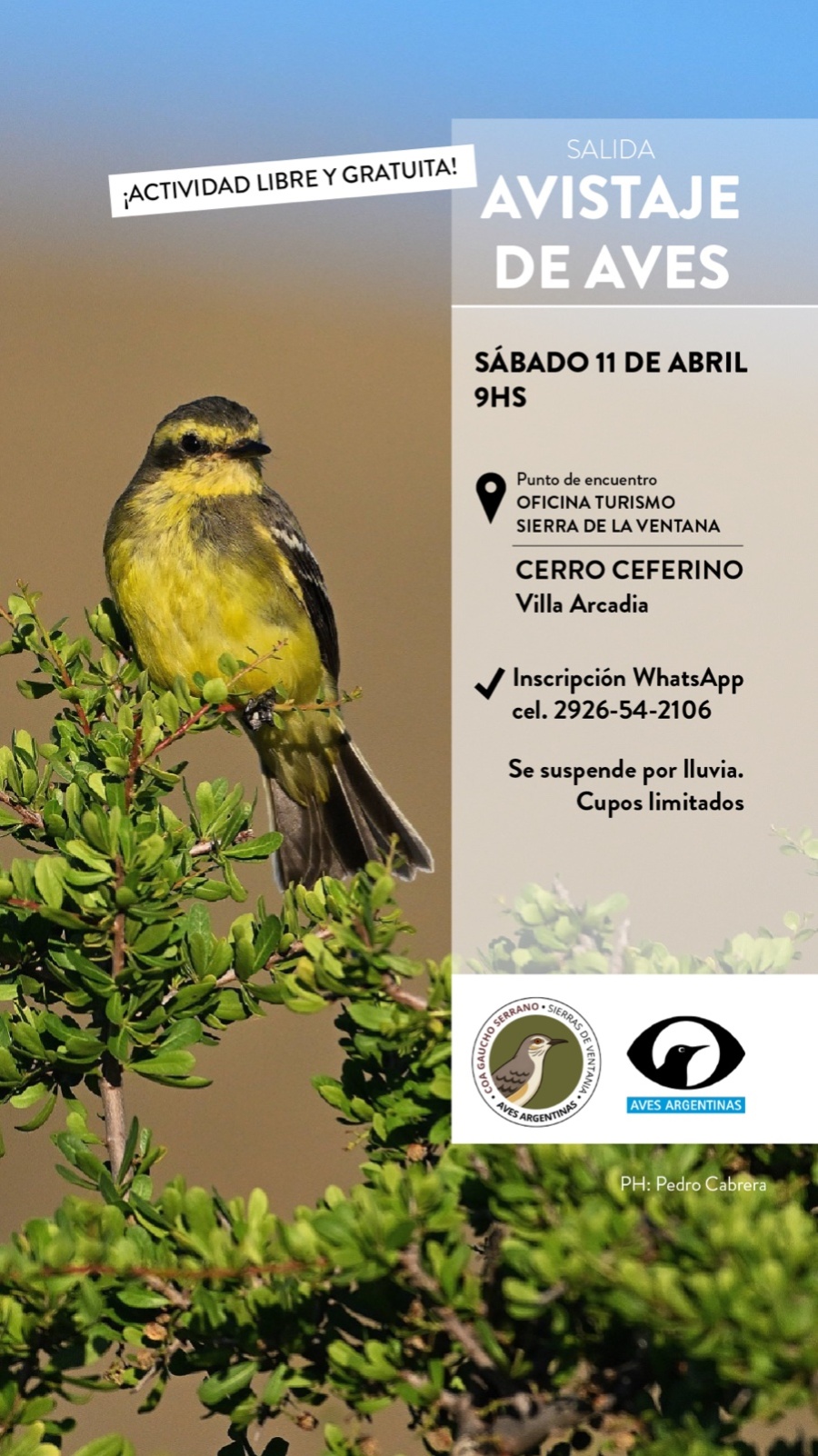 La propuesta es libre y gratuita, y está pensada tanto para quienes se inician en la actividad como para quienes ya tienen experiencia en el avistaje. La inscripción se realiza vía WhatsApp al 2926-542106 y se suspende en caso de lluvia.