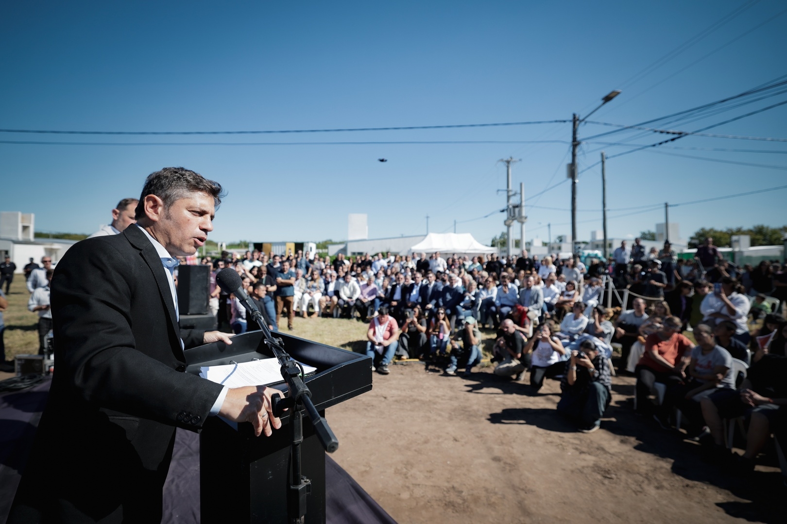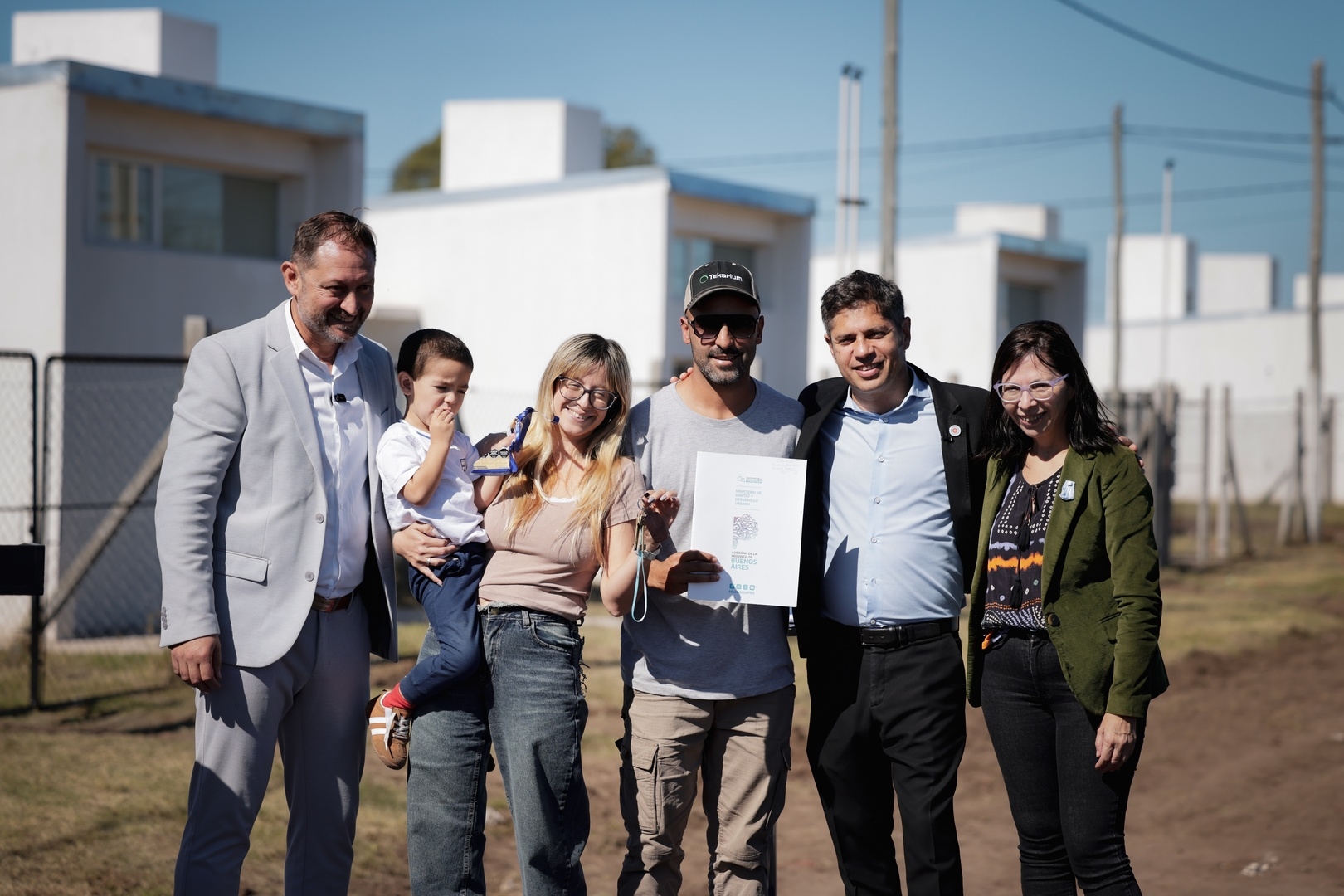 El gobernador de la provincia de Buenos Aires, Axel Kicillof, encabezó este viernes el acto de entrega de 38 viviendas para familias del municipio de Lincoln, junto a la ministra de Hábitat y Desarrollo Urbano, Silvina Batakis; y el intendente local, Salvador Serenal.
