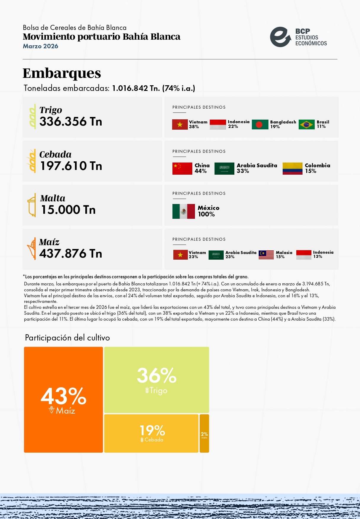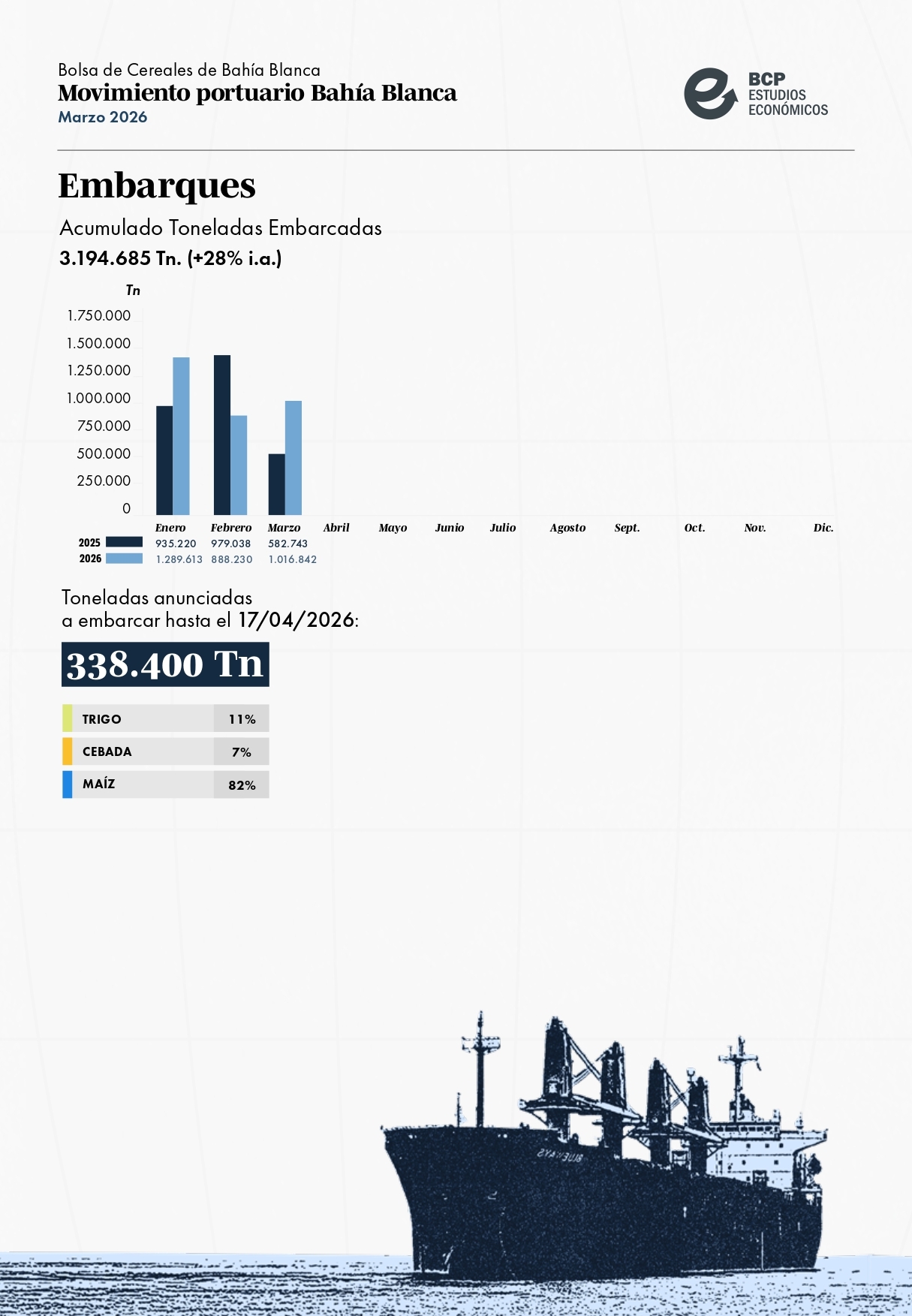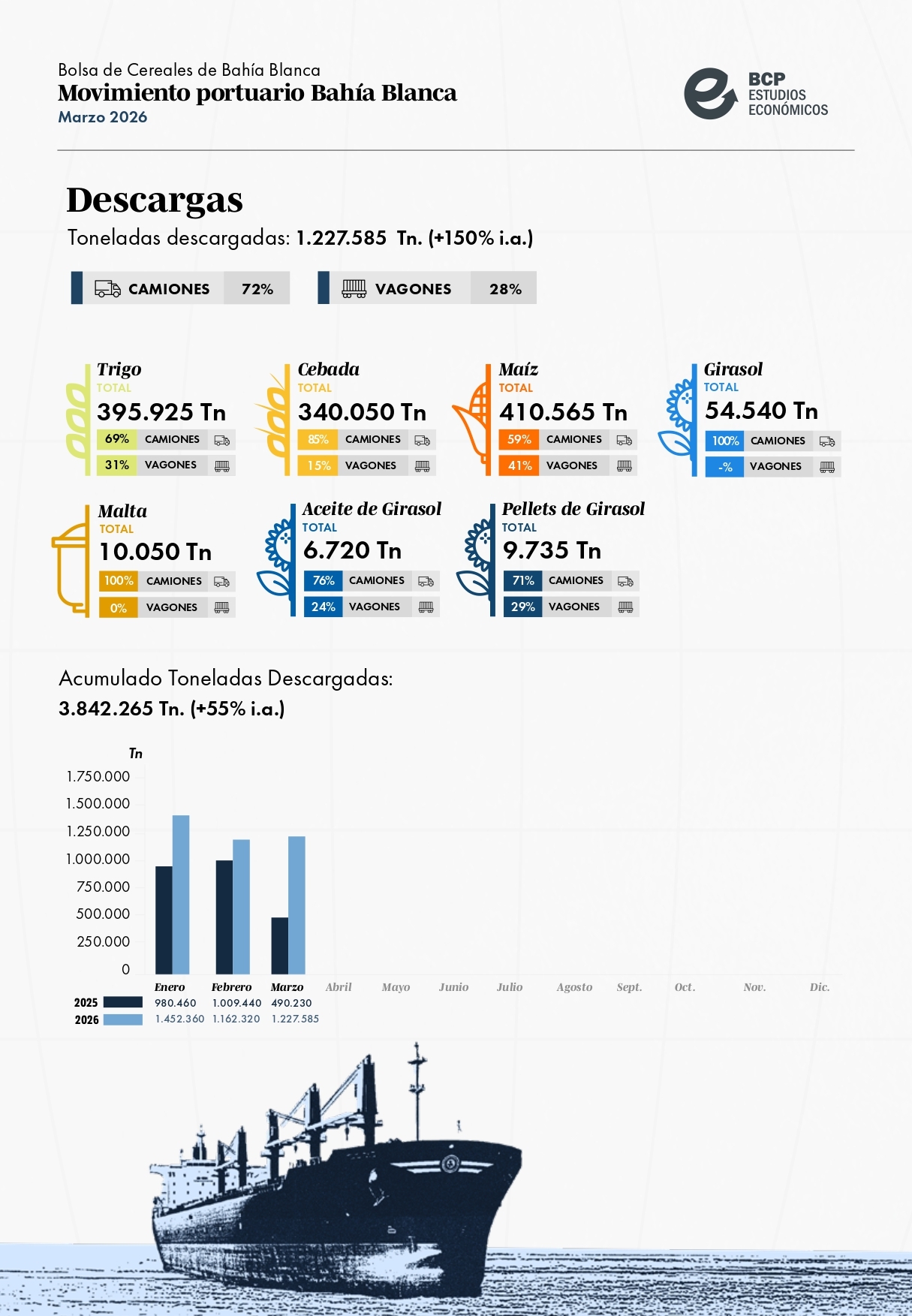 Movimiento Portuario de Bahía Blanca: Marzo de 2026 HOY 14:03:03 | 135 LECTURAS | GENERALES Informe elaborado por la Bolsa de Cereales y Productos de Bahía Blanca.