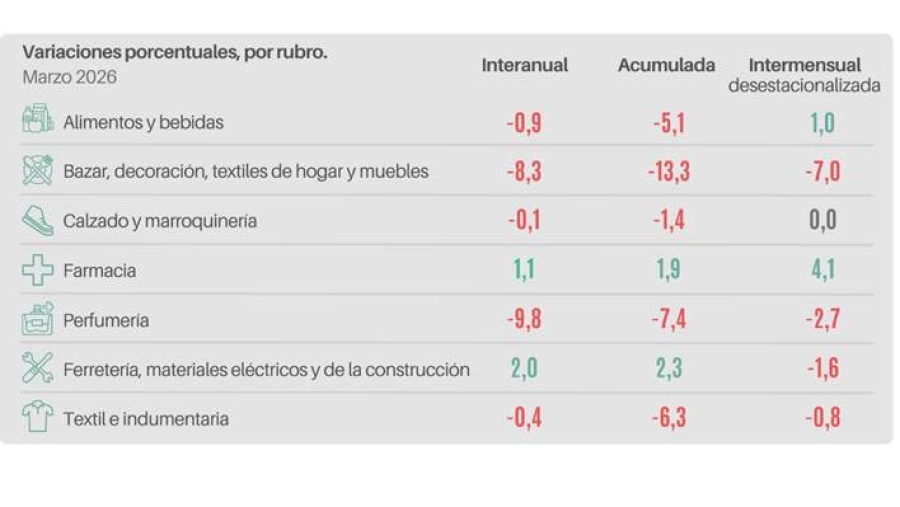 La evaluación por sectores validó la tendencia contractiva del período, con cinco de los siete rubros relevados en terreno negativo. Las mermas se localizaron en Perfumería (-9,8%), Bazar, decoración, textiles de hogar y muebles (-8,3%) y Alimentos y bebidas (-0,9%). En sentido opuesto, el segmento de Ferretería, materiales eléctricos y de la construcción creció un 2%, mientras que Farmacia marcó un alza del 1,1% interanual.
