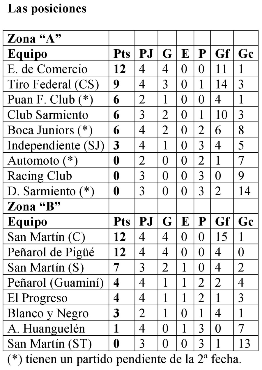 En lo más alto de la tabla no hubo cambios respecto del capítulo anterior, dado que Empleados de Comercio sigue como líder en la zona “A”, mientras San Martín de Carhué y Peñarol de Pigüé continúan como punteros en la zona “B”.