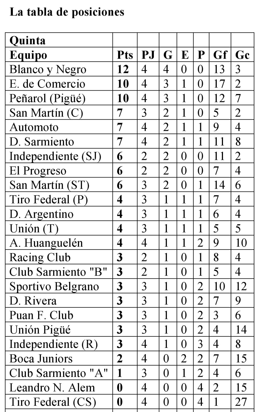 Quinta: Tiro Federal de Coronel Suárez 0 vs. Empleados de Comercio 11; San Martín de Santa Trinidad 8 vs. Unión Pigüé 0; Racing Club 5 vs. Leandro N. Alem 0; Independiente de Rivera 1 vs. El Progreso 3; Blanco y Negro 1 vs. Puan F. Club 0; Deportivo Argentino 0 vs. Atlético Huanguelén 0; Boca Juniors 3 vs. Deportivo Sarmiento 3; Club Sarmiento “Blanco” 4 vs. Deportivo Rivera 1; Automoto 3 vs. Club Sarmiento “Azul” 2 y Peñarol de Pigüé 2 vs. Unión de Tornquist 1. Libres: Independiente de San José, San Martín de Carhué, Sportivo Belgrano de Espartillar y Tiro Federal de Puan.