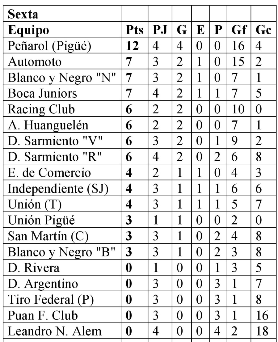 Sexta: Racing Club 9 vs. Leandro N. Alem 0; Blanco y Negro “Blanco” 2 vs. Puan F. Club 1; Deportivo Argentino 0 vs. Atlético Huanguelén 2; Deportivo Sarmiento “Verde” 2 vs. San Martín de Carhué 1; Boca Juniors 2 vs. Deportivo Sarmiento “Rojo” 0; Tiro Federal de Puan 0 vs. Blanco y Negro “Negro” 3 y Peñarol de Pigüé 5 vs. Unión de Tornquist 0. Libres: Independiente de San José, Empleados de Comercio, Unión Pigüé, Deportivo Rivera y Automoto.
