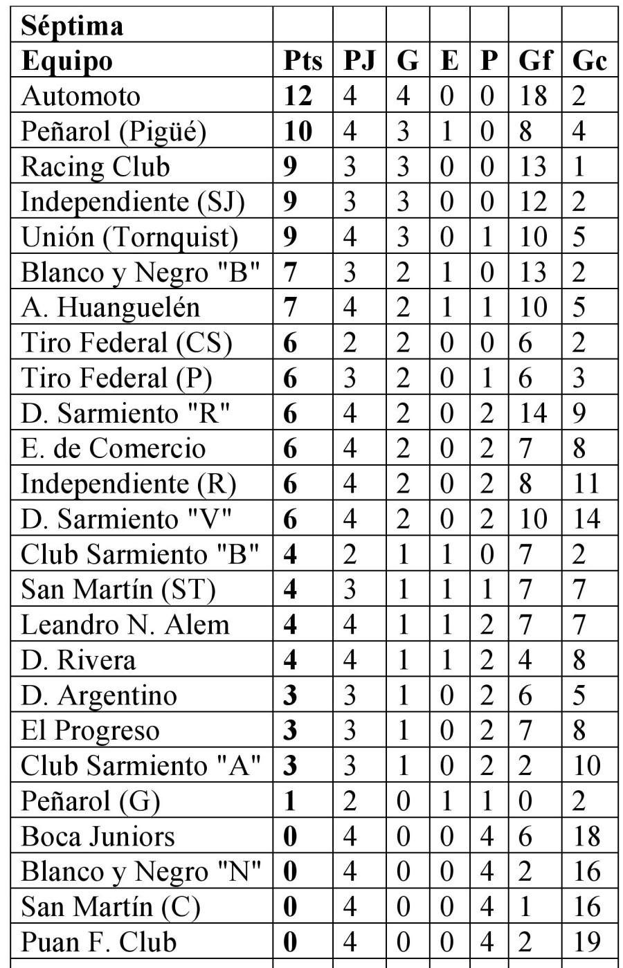 Séptima: Tiro Federal de Coronel Suárez 2 vs. Empleados de Comercio 1; Racing Club 1 vs. Leandro N. Alem 0; Independiente de Rivera 3 vs. El Progreso 2; Blanco y Negro “Blanco” 8 vs. Puan F. Club 0; Deportivo Argentino 1 vs. Atlético Huanguelén 2; Deportivo Sarmiento “Verde” 5 vs. San Martín de Carhué 0; Boca Juniors 2 vs. Deportivo Sarmiento “Rojo” 8; Club Sarmiento “Blanco” 5 vs. Deportivo Rivera 0; Automoto 5 vs. Club Sarmiento “Azul” 0; Tiro Federal de Puan 3 vs. Blanco y Negro “Negro” 0 y Peñarol de Pigüé 2 vs. Unión de Tornquist 1. Libres: Independiente de San José, San Martín de Santa Trinidad y Peñarol de Guaminí.