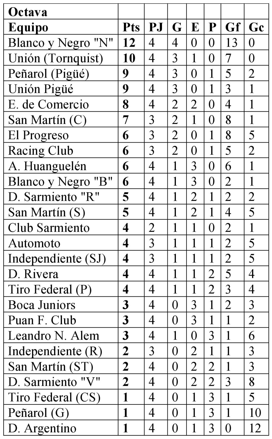 Octava: Tiro Federal de Coronel Suárez 0 vs. Empleados de Comercio 1; San Martín de Santa Trinidad 0 vs. Unión Pigüé 1; Racing Club 0 vs. Leandro N. Alem 1; Independiente de Rivera 0 vs. El Progreso 2; Blanco y Negro “Blanco” 0 vs. Puan F. Club 0; Deportivo Argentino 0 vs. Atlético Huanguelén 5; Peñarol de Guaminí 1 vs. San Martín de Saavedra 1; Deportivo Sarmiento “Verde” 1 vs. San Martín de Carhué 1; Boca Juniors 1 vs. Deportivo Sarmiento “Rojo” 1; Club Sarmiento “Blanco” 1 vs. Deportivo Rivera 0; Tiro Federal de Puan 0 vs. Blanco y Negro “Negro” 3 y Peñarol de Pigüé 0 vs. Unión de Tornquist 2. Libres: Independiente de San José y Automoto.