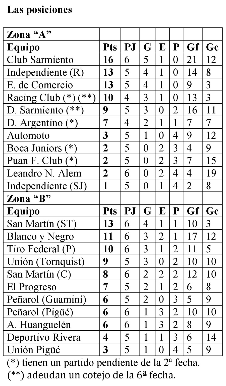 Por otro lado, Club Sarmiento derrotó 3-2 a Automoto en Pigüé y no detiene su marcha como puntero invicto de la zona “A”, en la que Independiente de Rivera (venció 3-2 a Puan F. Club) y Empleados de Comercio (igualó 0-0 con Alem) son sus escoltas a tres puntos y con un partido menos.