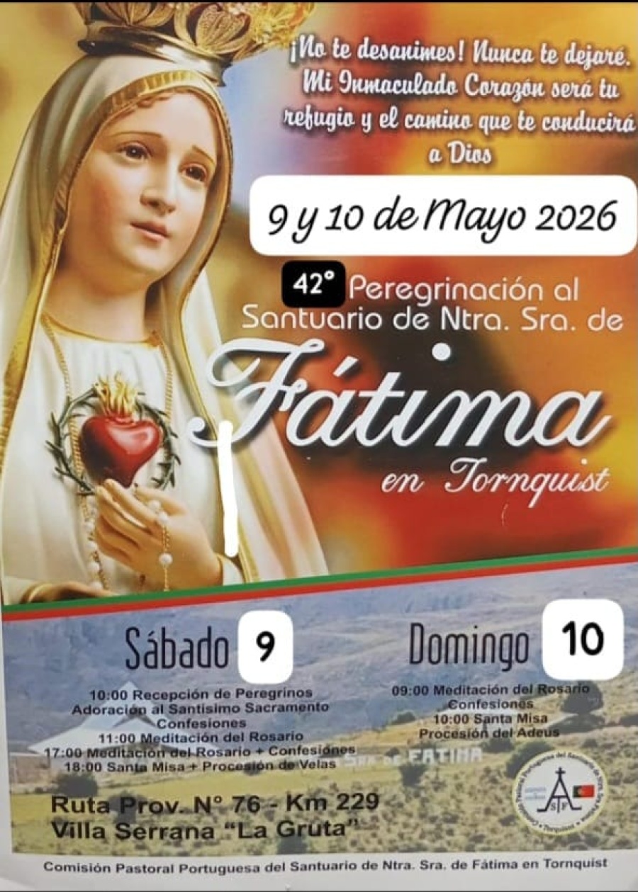 Tornquist será escenario de una nueva edición de la tradicional peregrinación al Santuario de Nuestra Señora de Fátima, que se desarrollará los días 9 y 10 de mayo en Villa Serrana La Gruta. Durante el fin de semana habrá recepción de peregrinos, misas, confesiones, rosarios y una emotiva procesión de velas.