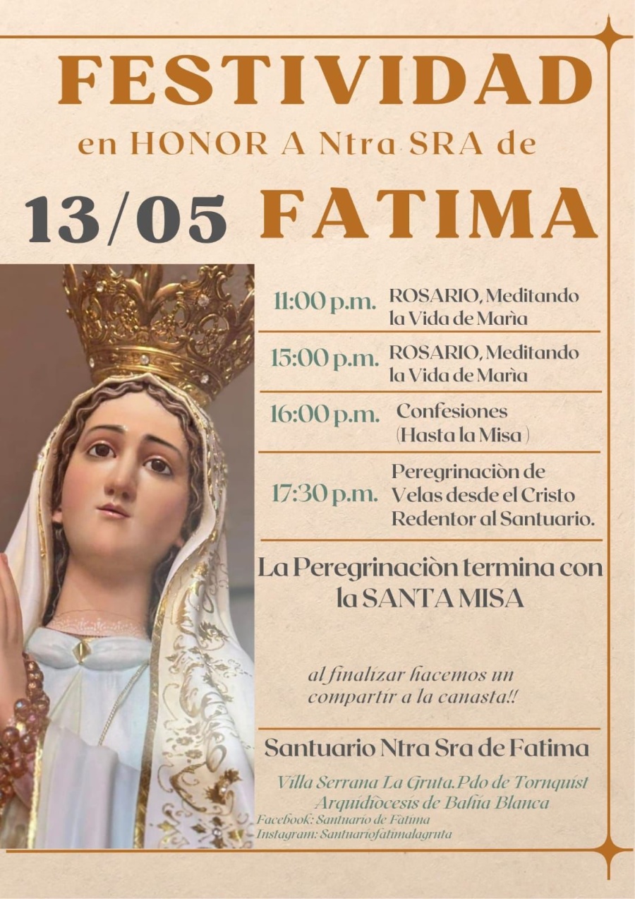 Las actividades continuarán el 13 de mayo con la festividad en honor a la Virgen de Fátima, que incluirá momentos de oración, confesiones y la peregrinación hacia el santuario, culminando con la Santa Misa y un encuentro comunitario a la canasta.