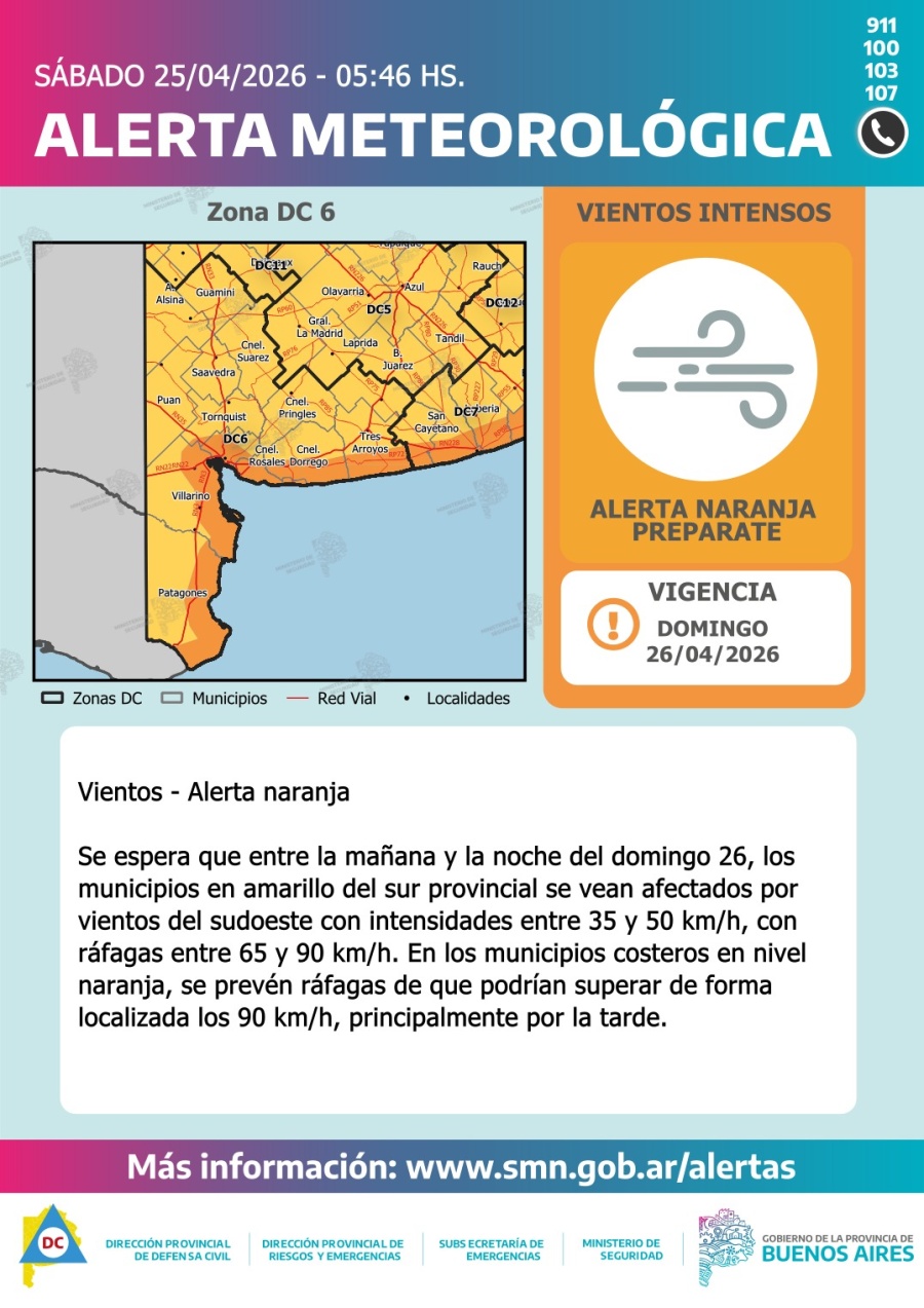 El Servicio Meteorológico Nacional anticipa para este domingo 26 de abril una jornada marcada por condiciones adversas en Tornquist y la región, con un fuerte protagonismo del viento y un marcado descenso de la temperatura.