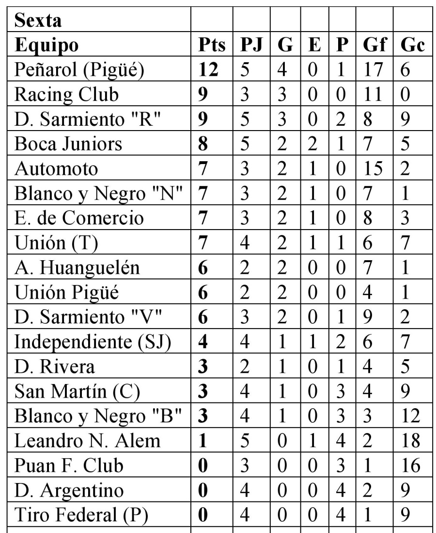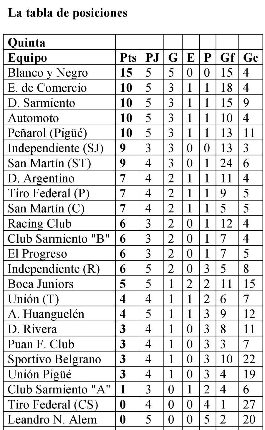 Se mantuvieron al frente Blanco y Negro en 5ª; Peñarol de Pigüé en 6ª, aunque Deportivo Sarmiento “Rojo” le ganó 2-1 y le quitó el invicto; Automoto de Tornquist en 7ª y Blanco y Negro “Negro” en 8ª.