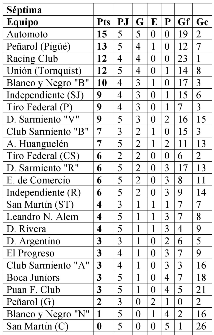 Séptima: Leandro N. Alem 0 vs. Boca Juniors 1; San Martín de Carhué 0 vs. Racing Club 10; Atlético Huanguelén 1 vs. Club Sarmiento “Blanco” 8; Deportivo Sarmiento “Rojo” 3 vs. Peñarol de Pigüé 4; Empleados de Comercio 1 vs. Blanco y Negro “Blanco” 3; Blanco y Negro “Negro” 0 vs. Peñarol de Guaminí 0; El Progreso 0 vs. Automoto 1; Puan F. Club 3 vs. Independiente de Rivera 1; Deportivo Rivera 0 vs. Tiro Federal de Puan 1; Club Sarmiento “Azul” 1 vs. Deportivo Sarmiento “Verde” 6 y Unión de Tornquist 4 vs. Independiente de San José 3. Libres: Tiro Federal de Coronel Suárez, Deportivo Argentino y San Martín de Santa Trinidad.