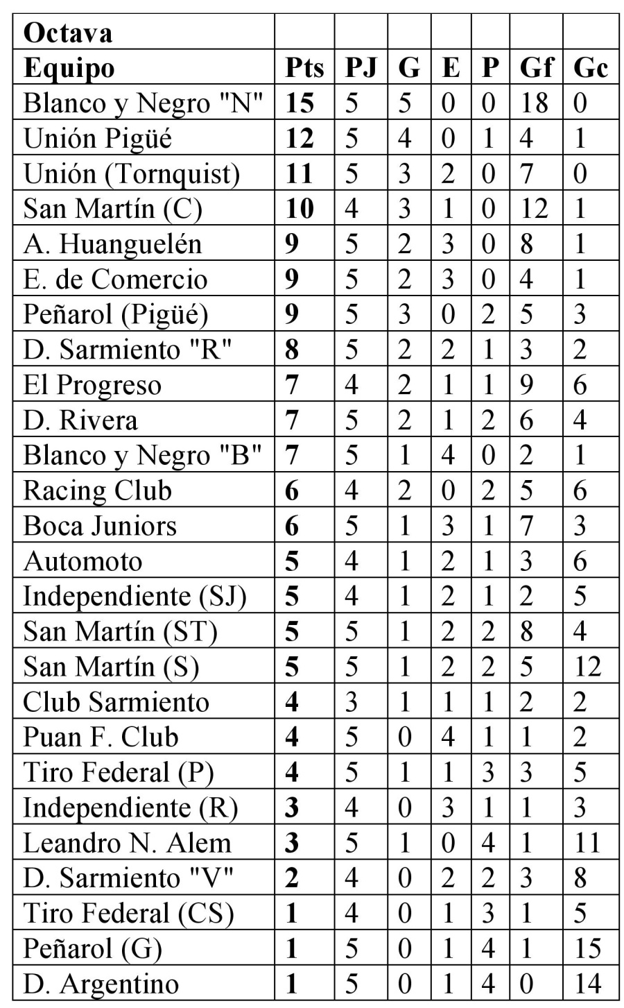 Octava: Leandro N. Alem 0 vs. Boca Juniors 5; San Martín de Carhué 4 vs. Racing Club 0; Atlético Huanguelén 1 vs. Club Sarmiento 0; Deportivo Sarmiento “Rojo” 1 vs. Peñarol de Pigüé 0; Empleados de Comercio 0 vs. Blanco y Negro “Blanco” 0; Blanco y Negro “Negro” 5 vs. Peñarol de Guaminí 0; El Progreso 1 vs. Automoto 1; Puan F. Club 0 vs. Independiente de Rivera 0; Unión Pigüé 1 vs. Deportivo Argentino 0; Deportivo Rivera 1 vs. Tiro Federal de Puan 0; San Martín de Saavedra 1 vs. San Martín de Santa Trinidad 7 y Unión de Tornquist 0 vs. Independiente de San José 0. Libres: Tiro Federal de Coronel Suárez y Deportivo Sarmiento “Verde”.