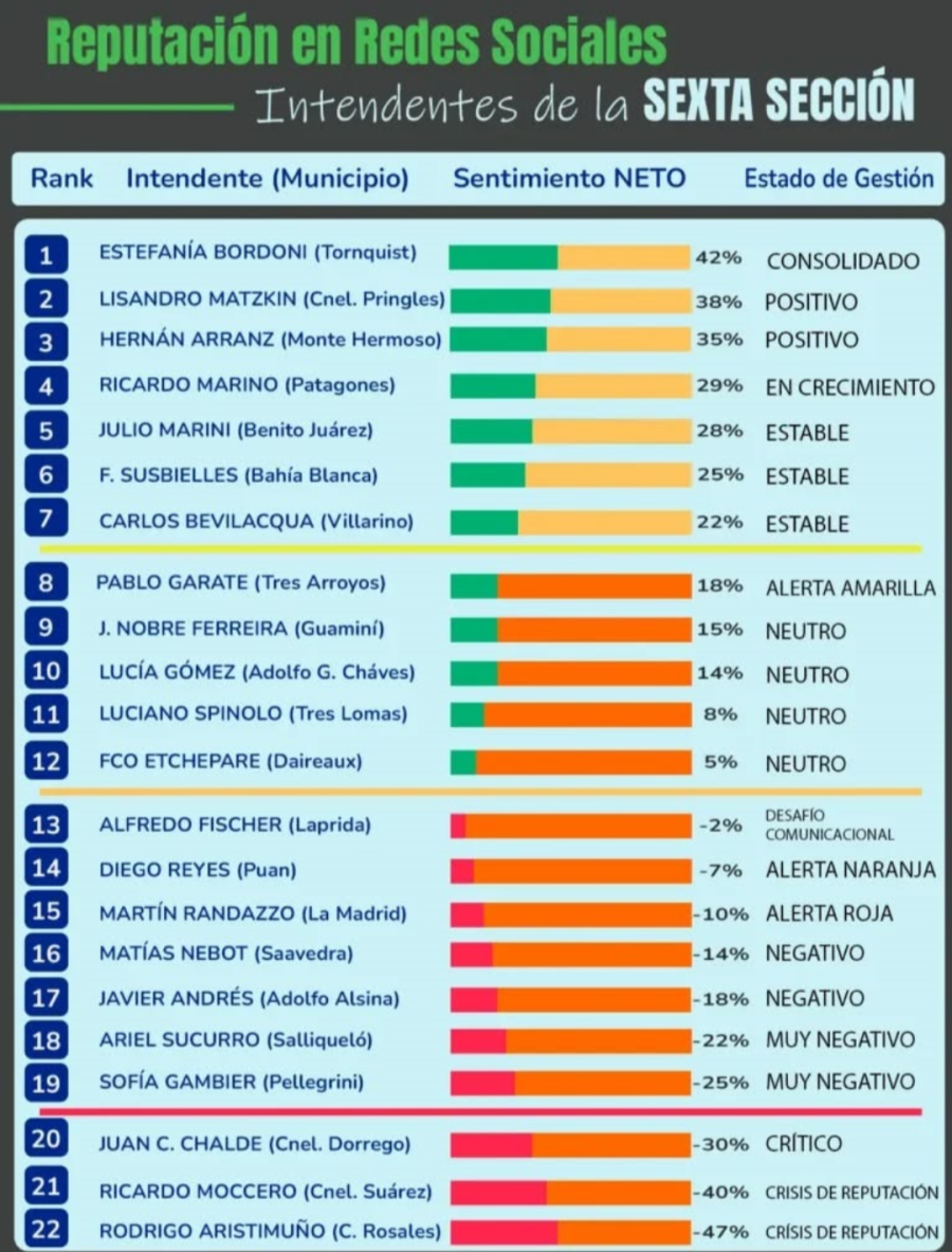 El ranking también enciende luces de alarma. Pablo Garate (Tres Arroyos, 18%) entra en “Alerta Amarilla”, mostrando los primeros síntomas de desgaste comunicacional.