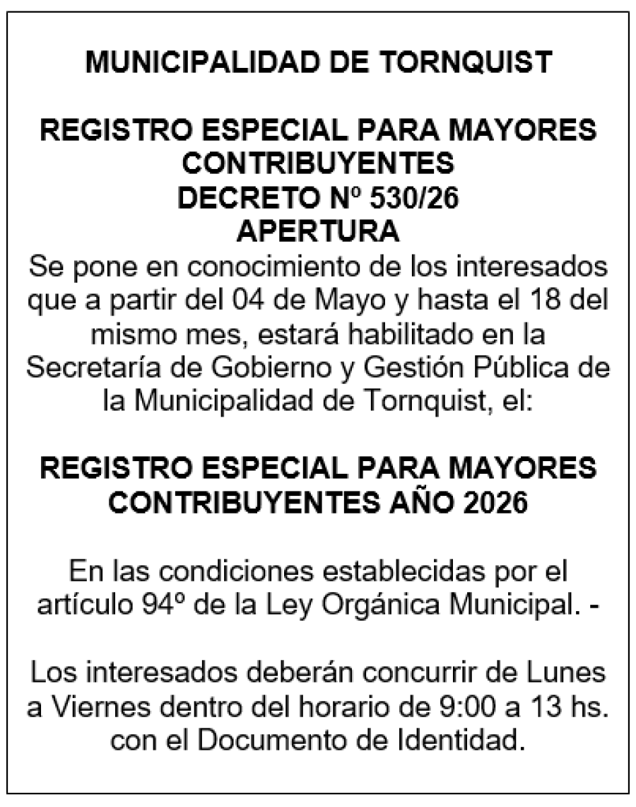 Apertura del Registro Especial para Mayores Contribuyentes 2026 AYER 09:54:24 | 237 LECTURAS | MUNICIPALES Informa Tornquist Municipio.
